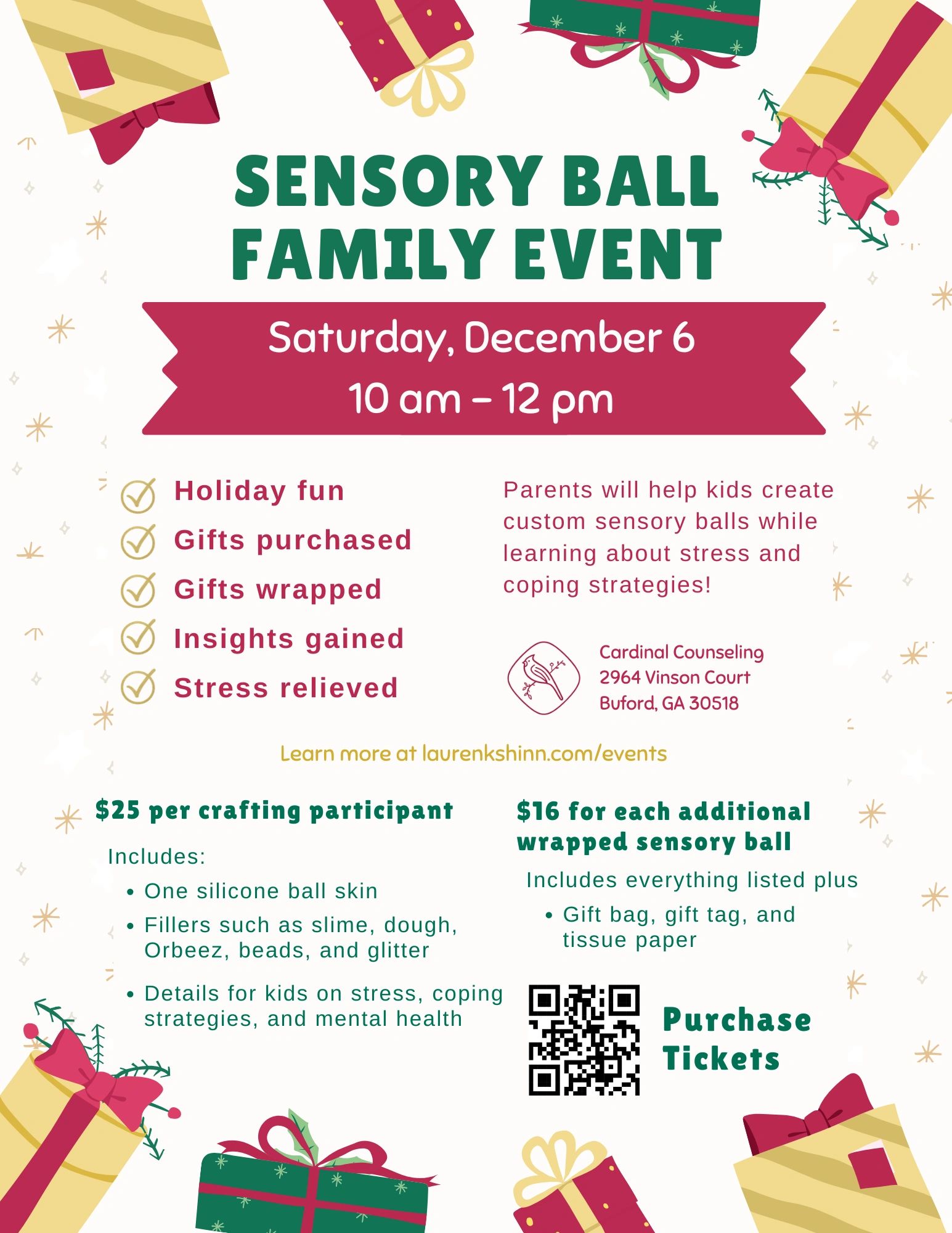 Come join us for a fun-filled event at Cardinal Counseling Group! Parents will help kids create a custom sensory balls while learning about stress and coping strategies. Participants can also make sensory balls as gifts and leave with them wrapped, tagged, and ready to put under the tree!